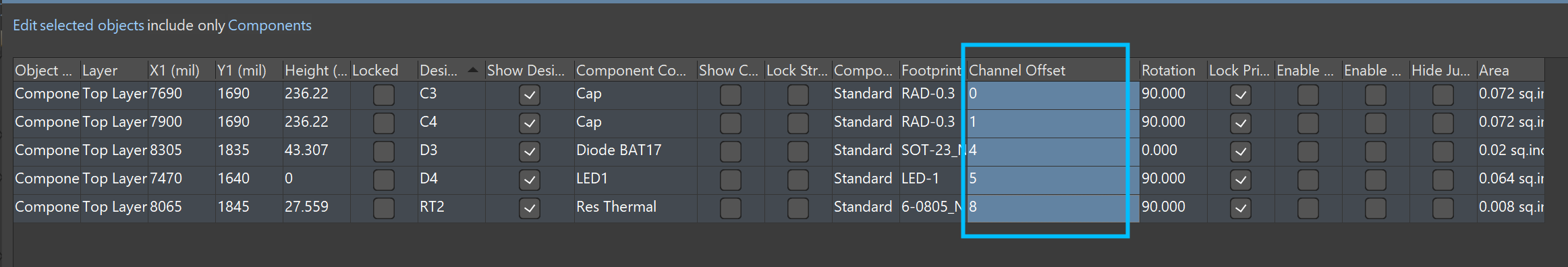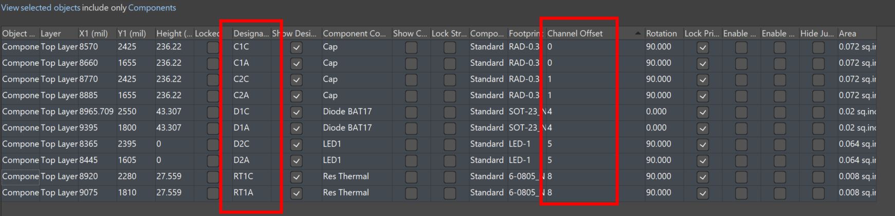 5)選中一組器件,打開PCB List,根據圖19中設置,將元器件按位號排序,然后復制Channel Offset這一列的數字。選中另一組元器件,打開PCB List,同樣按位號排序,把復制的Channel Offset的數字粘貼進去,確保兩組元器件對應運期間的Channel Offset數值一致。