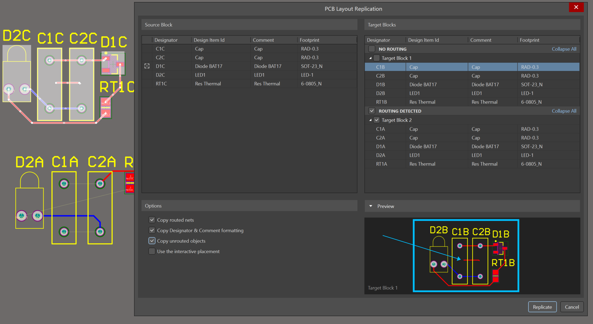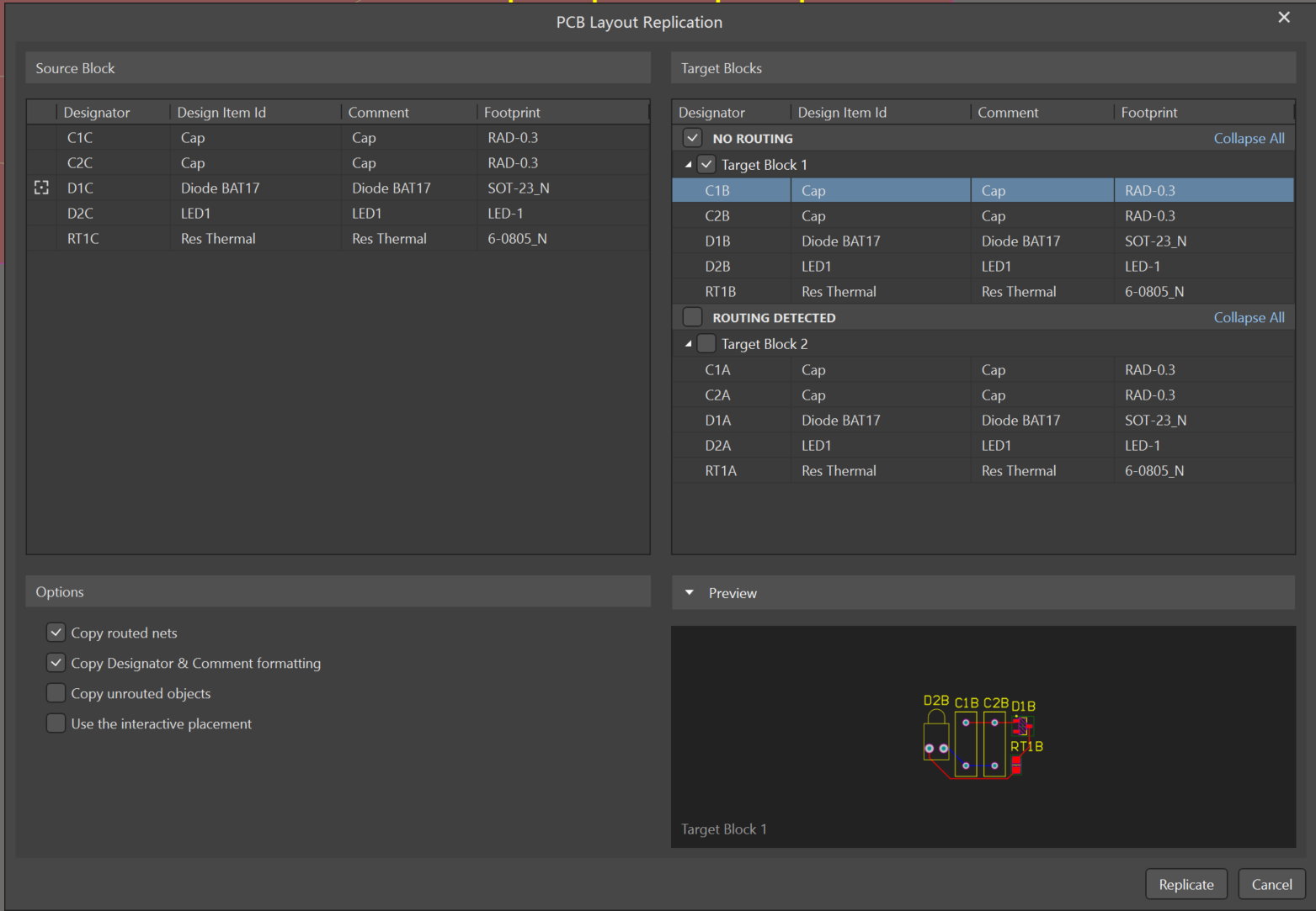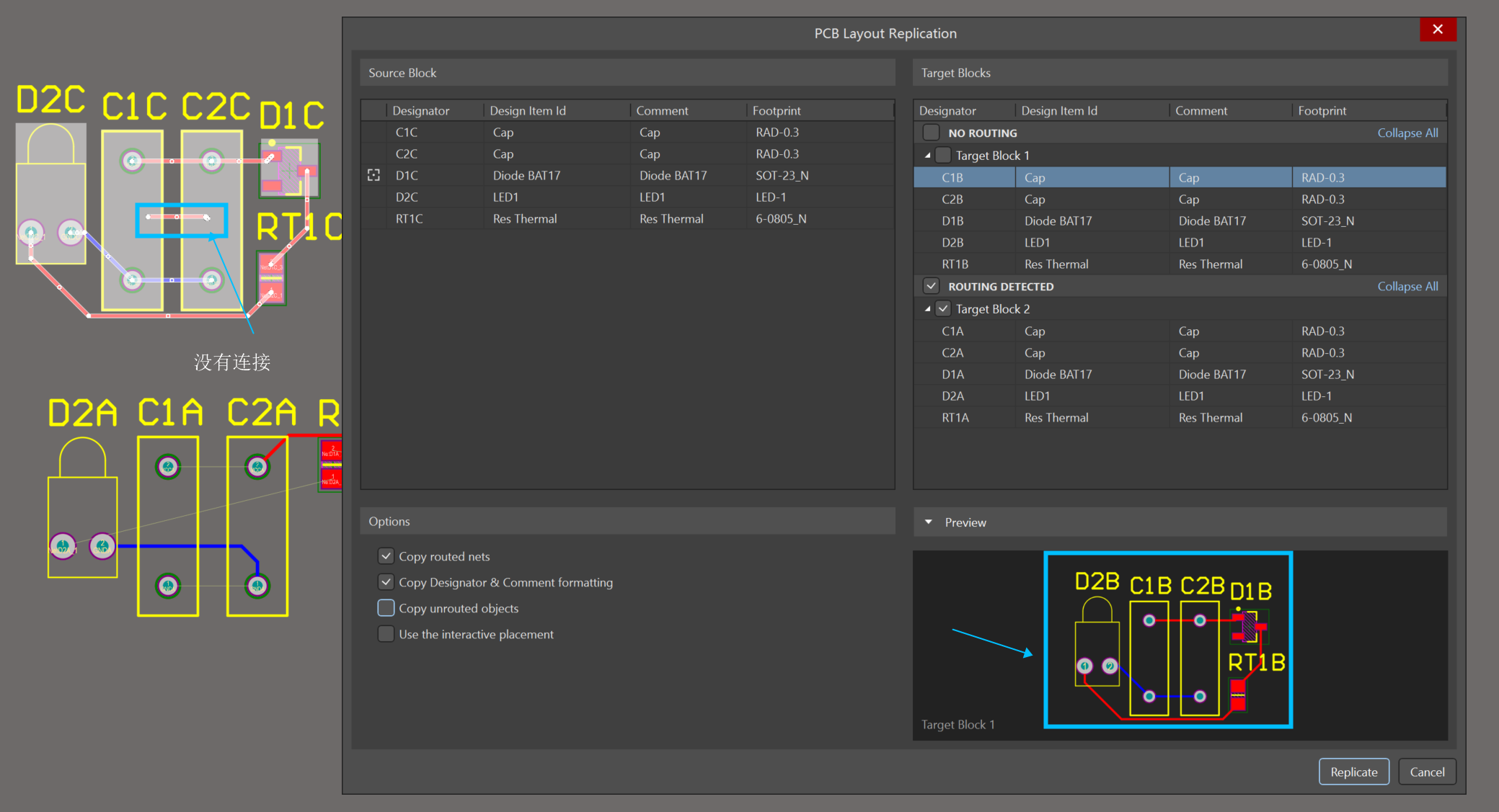 先完成一組電路的布局布線,全選中這組電路,運行PCB Layout Replication后彈出設置窗口,如圖10。左側Source Block是已經完成的源模塊,右側Target Blocks是軟件自動識別出和源模塊完全一致,可以進行復制的模塊右下Preview是目標模塊完成復制后的預覽圖。在右側目標模塊中選擇想要進行復制的模塊,其他默認就能將布局布線復制。