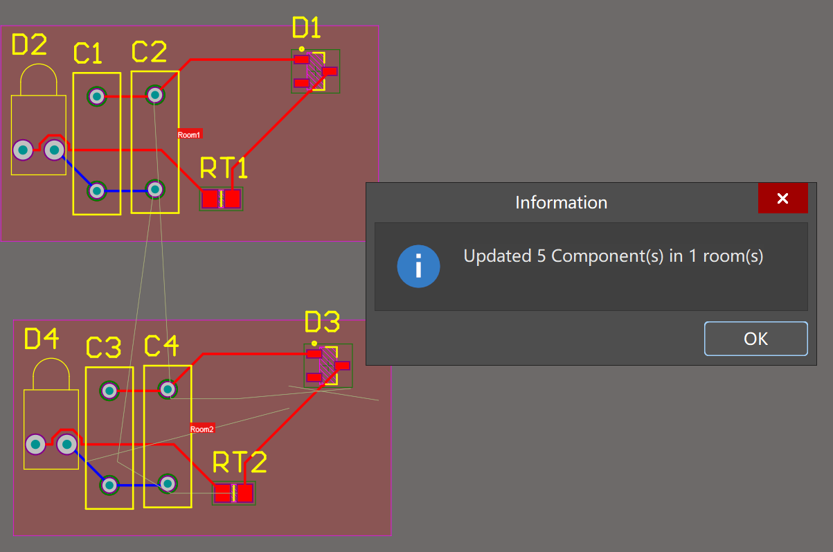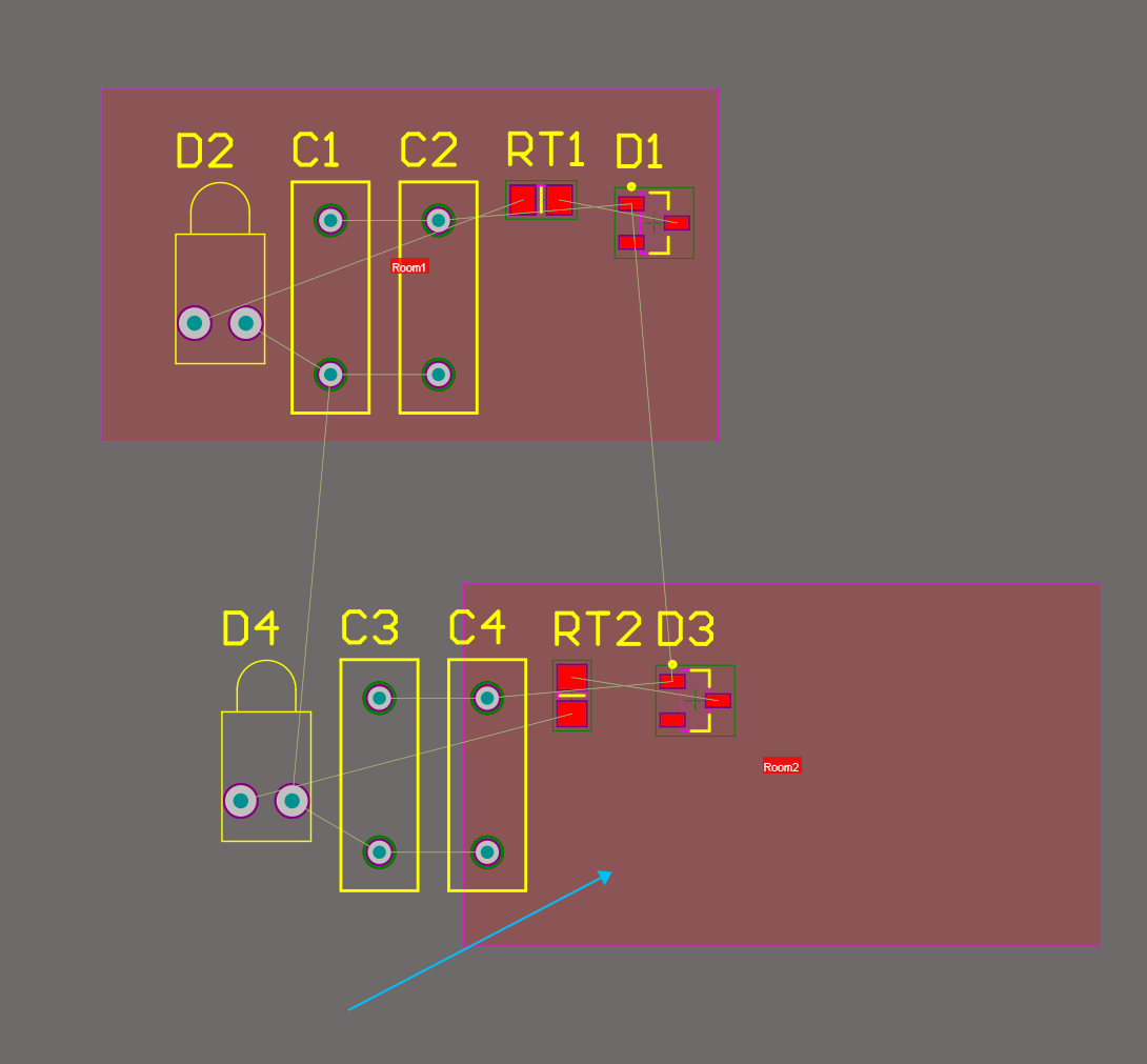 2)分別對兩組元器件添加Room,如圖15,此時并不能執行拷貝Room格式來進行復制,移動Room可以發現,元器件并不會跟隨Room移動,因為它們之間還沒有建立連接關系。