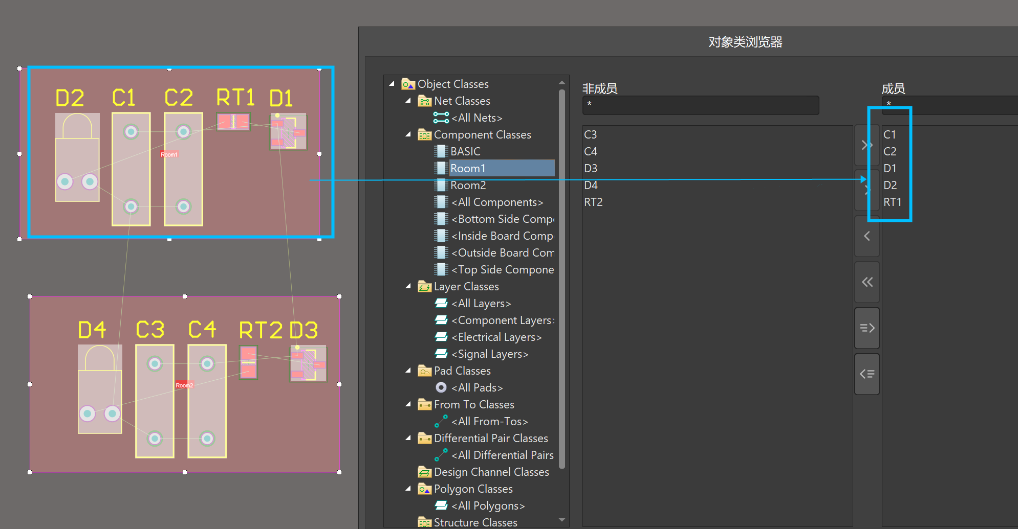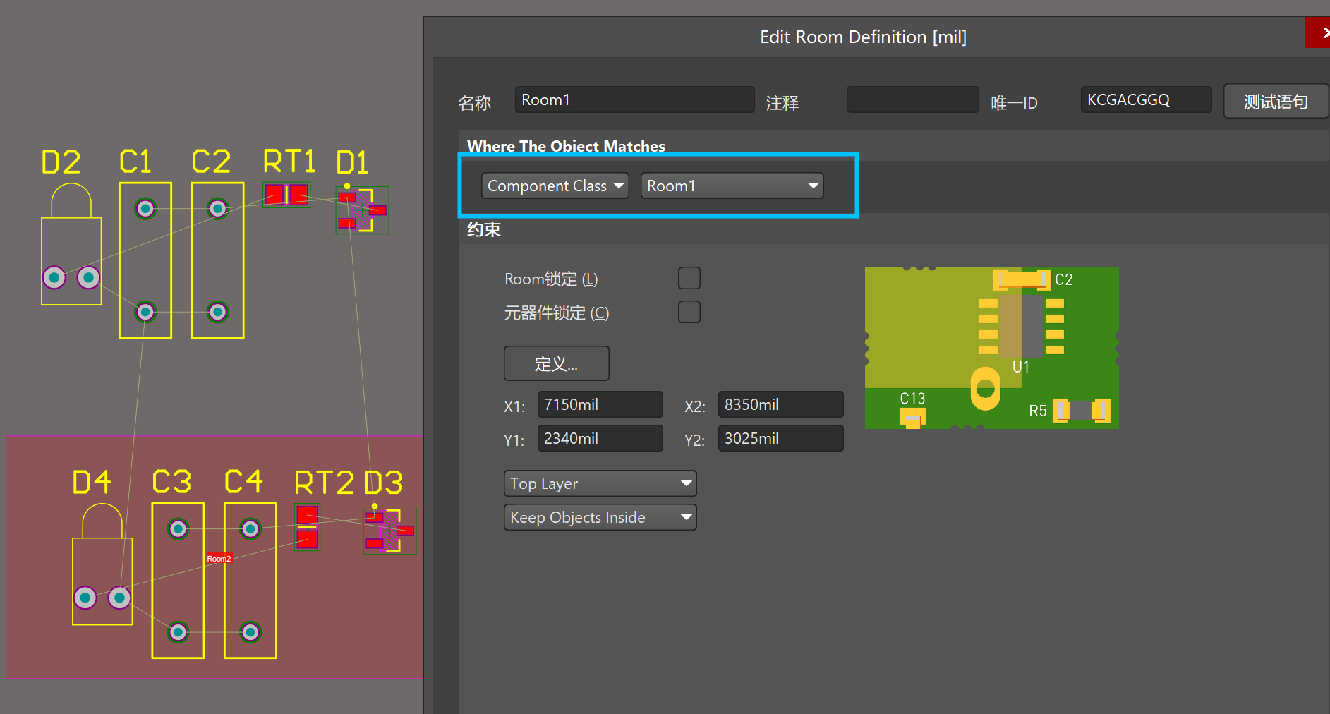 4)分別雙擊兩個Room,將適用對象選擇對應的Component Class。此時再去拖動Room,會發現元器件會隨著Room一起移動,這就表示Room和元器件已經關聯起來了。也可以使用圖18中“從選擇的器件創建Room”來直接生成一個Room,這樣也可以將Room和元器件關聯。