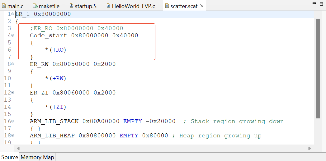 在ArmDS中,在鏈接腳本(Scatter文件)中定義一些變量,然后在C文件中引用。例如在鏈接腳本中定義這個變量code_start ; 然后在C語言函數(shù)中extern 這個變量。