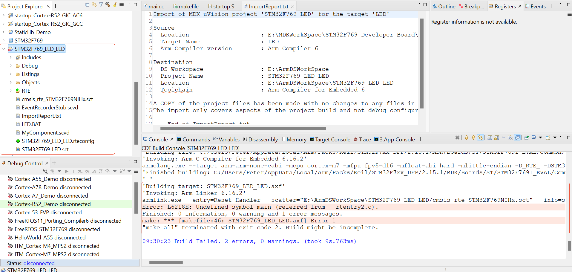 當用ArmDS導入Keil MDK的工程(在MDK中工程可以正常編譯)后,無法正常編譯,如圖2-1所示: