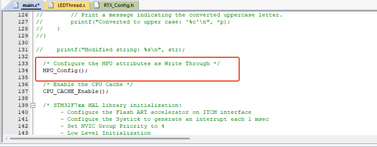 在Keil MDK中,用RTOS2后,在Main函數(shù)中開啟MPU初始化后,RTX5的線程無法正常啟動,如圖2-1所示: