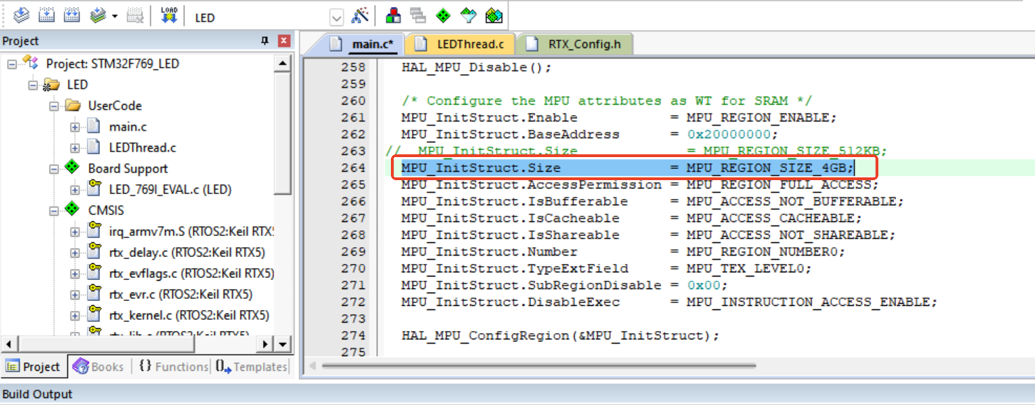 注:當(dāng)MPU的區(qū)域大小設(shè)置為MPU_REGION_SIZE_4GB時,它覆蓋了一個非常大的內(nèi)存區(qū)域,這通常包括了整個地址空間,因此不太可能限制到RTX線程所需的特定內(nèi)存區(qū)域。而當(dāng)設(shè)置為MPU_REGION_SIZE_512KB時,覆蓋的內(nèi)存區(qū)域較小,如果這個區(qū)域沒有正確覆蓋RTX線程的棧空間或需要訪問的內(nèi)存區(qū)域,就可能導(dǎo)致線程無法正常啟動。