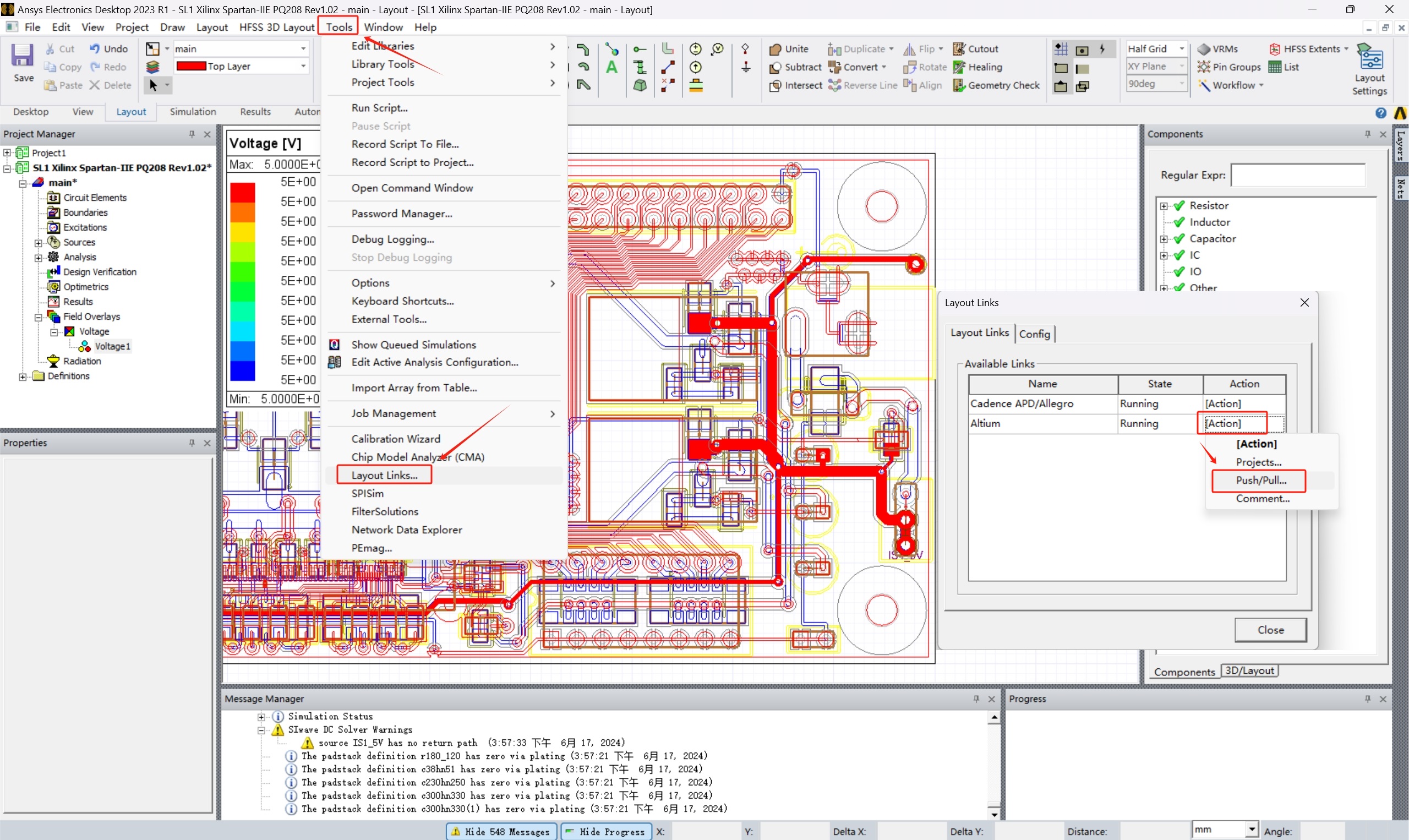 仿真工程師做好仿真工作后,導航至菜單欄的【Tools】選項,繼而選取【Layout Links】以啟動該功能的對話框。在對話框內,通過依次選擇 Altium 的【Action】菜單并點選【Push/Pull】