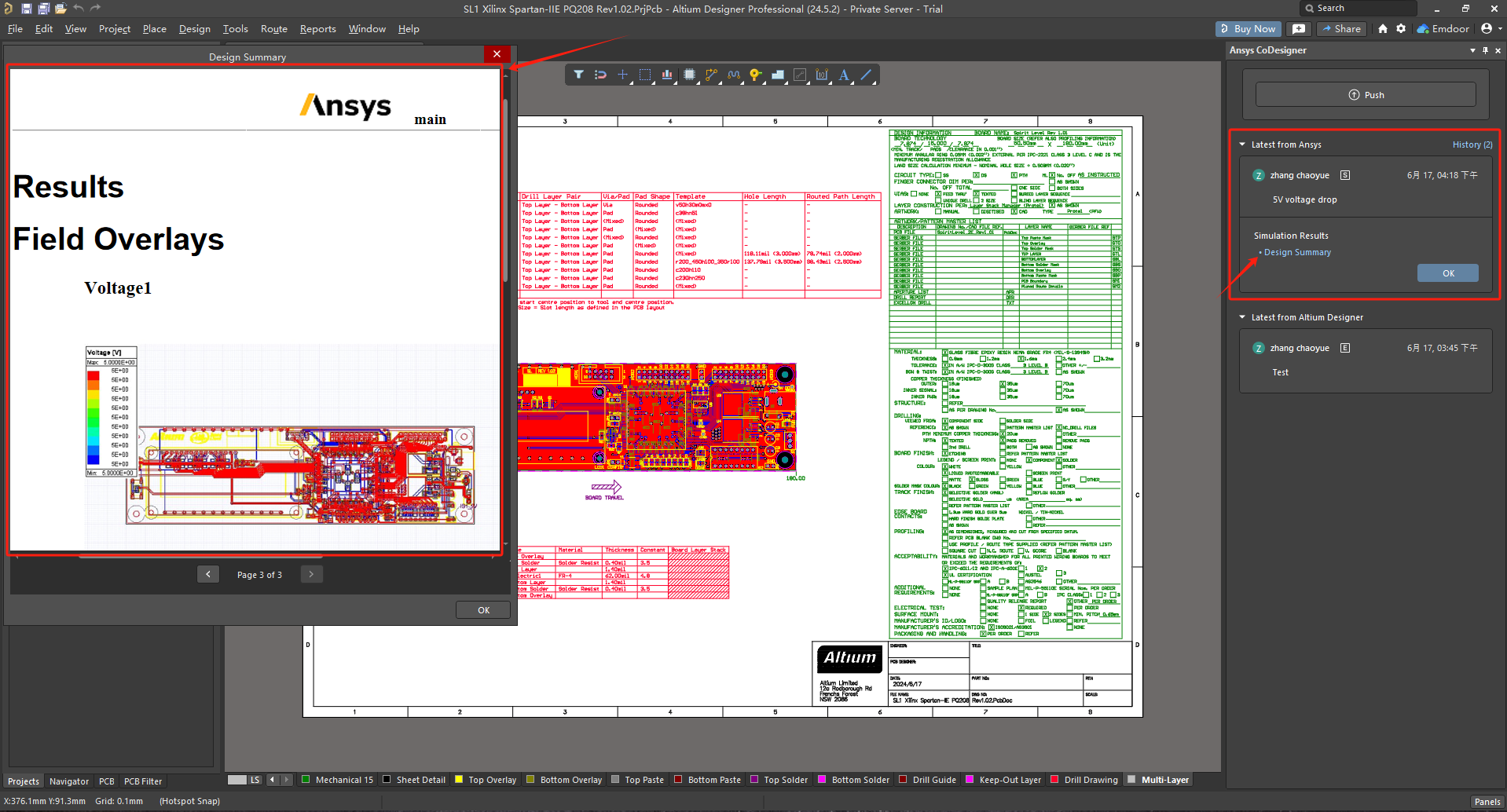 在完成上一階段的 AEDT 進行仿真分析之后,通過將詳盡的仿真報告集成至Altium 365平臺,我們實現了仿真數據的云同步。隨后,在返回至 Altium Designer 24 的環境中,在 Ansys Codesigner 模塊下,仿真工程師的細致點評與仿真輸出報告隨即出現。在此基礎上,僅需點擊【Simulation Results】下的【Design Summary】按鈕,即可即時開啟并深入探究仿真結果的詳細概覽,這一過程不僅促進了設計與仿真環節間的無縫銜接,還極大地提升了工作效率及設計驗證的精確性。