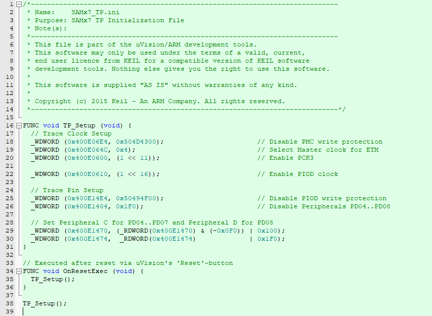 初始化文件的內(nèi)容如圖所示:(注:不同型號(hào)的芯片的對(duì)應(yīng)trace功能的初始化文件可能不一致,不同芯片的trace功能的初始化文件可以參考幫助文檔Configure Cortex-M Devices for Tracing部分)