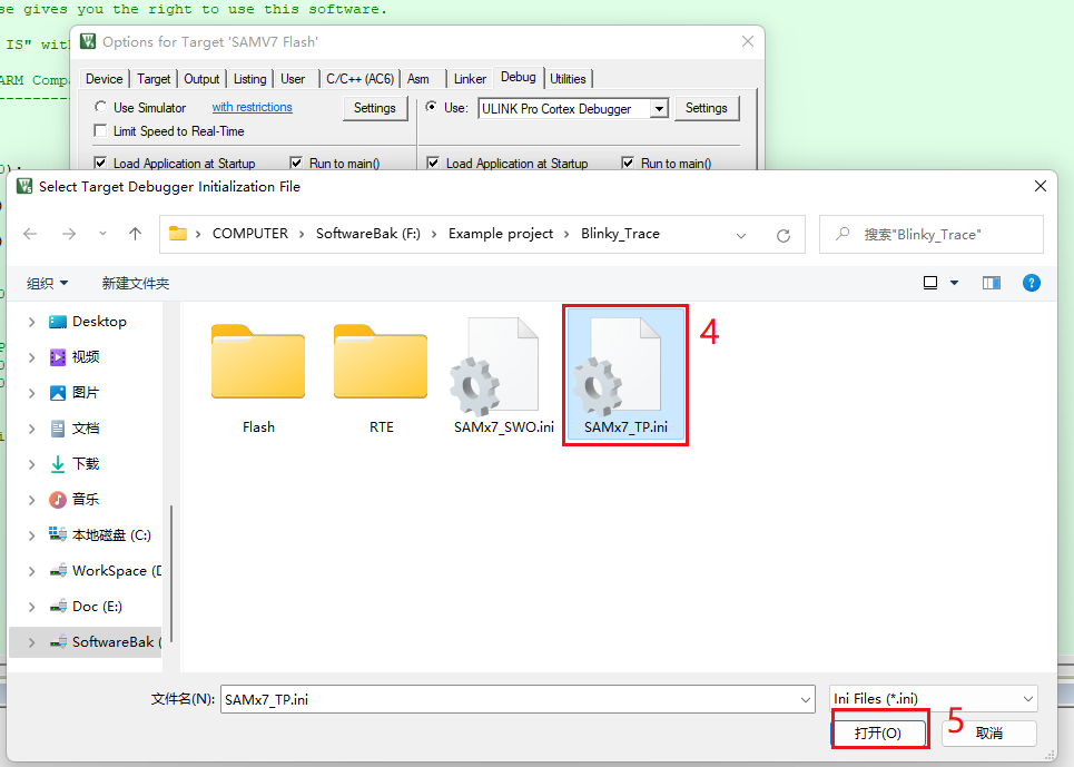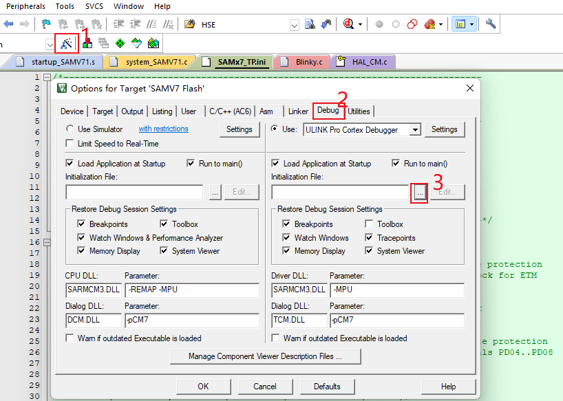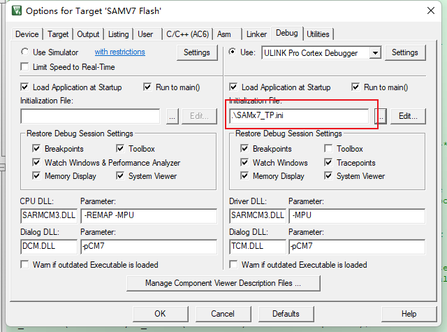2、添加初始化文件:將初始化文件添加到Keil->option for target->Debug->Initialization File中,