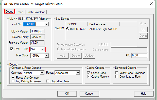 (2)在Debug選項(xiàng)中,需要將port選擇SW接口