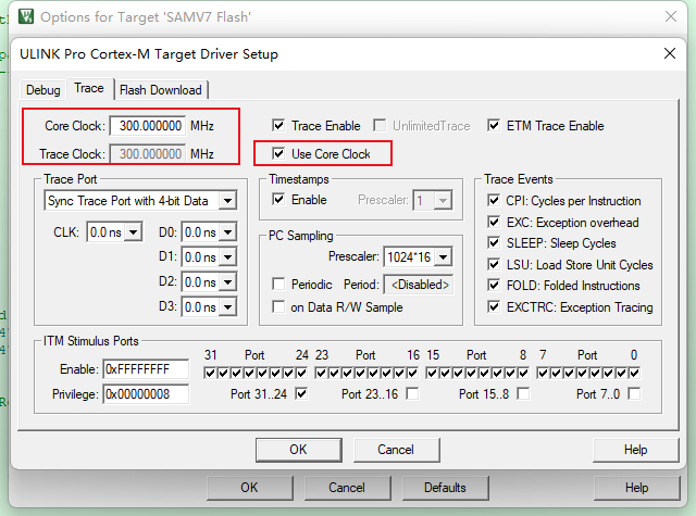 (3)然后在trace配置上,需要設(shè)置core clock,核心時(shí)鐘必須與設(shè)備配置相對(duì)應(yīng)。并且勾選”Use Core Clock”,讓trace clock和core clock保持一致。