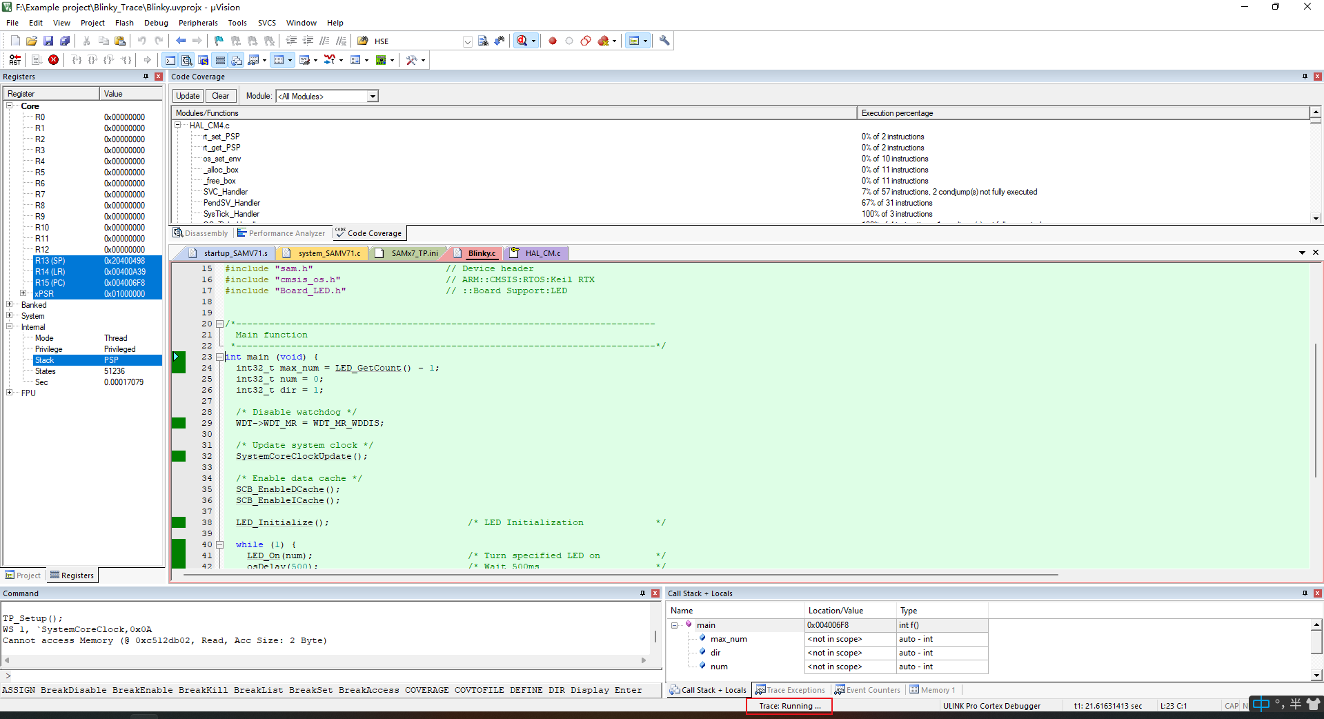 5、完成上述步驟,Trace功能和ETM功能就配置完成,進(jìn)入調(diào)試界面后,界面下方出現(xiàn)”Trace: Running”則表示配置成功,可以使用Trace、ETM功能。