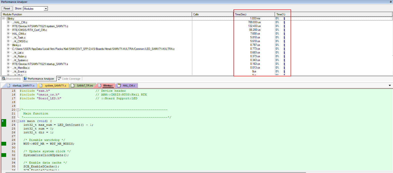 2、性能分析功能:可以查看工程中每一個(gè)文件、函數(shù)、語(yǔ)句的執(zhí)行時(shí)間和占用總時(shí)間的比例。