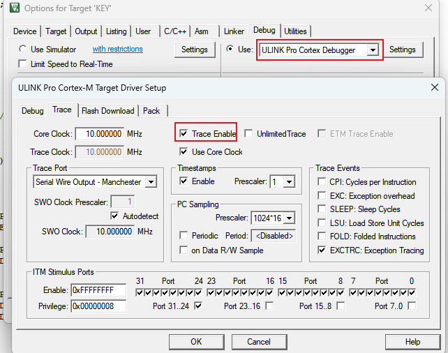 注意:Logic Analyzer功能在這里使用的SW接口進行調試,非ETM接口。Logic Analyzer功能使能Trace的時候勾選Trace Enable選項即可,和性能分析、代碼覆蓋率不一樣,不需要芯片具備Trace數據端口。