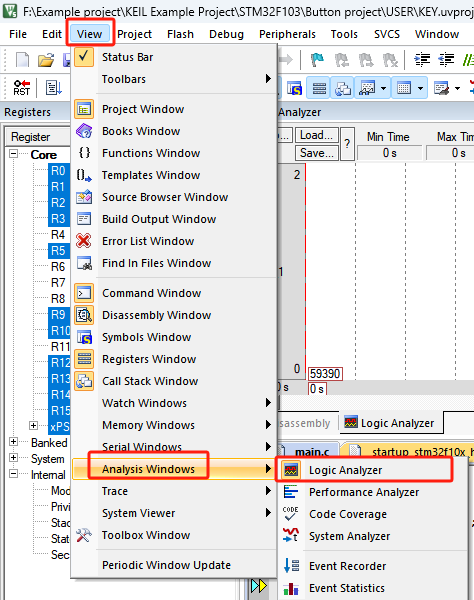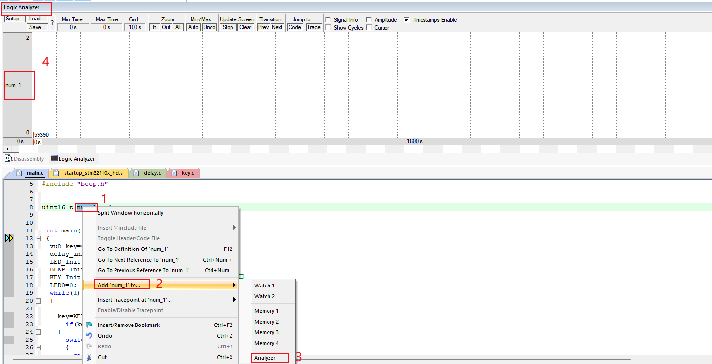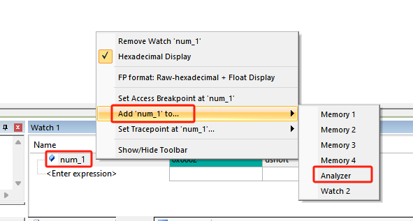 2. 想要將變量添加到Logic Analyzer窗口中,可以在代碼中直接選中對應的變量,然后,右鍵選擇Add ‘xxx’ to ...->Analyzer。然后,我們就可以在Logic Analyzer窗口中看到變量被添加到進去了(如圖2-4)?;蛘咭部梢酝ㄟ^watch窗口中去添加(如圖2-5)。