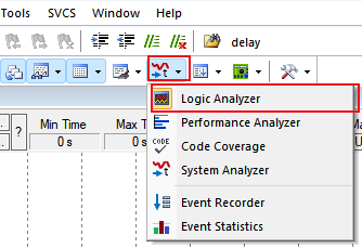 1. Logic Analyzer窗口可以通過菜單中View->Analysis Windows->Logic Analyzer去打開(如圖2-2),或者可以通過工具欄中System Analysis WIndows的圖標去打開Logic Analyzer窗口(如圖2-3)。