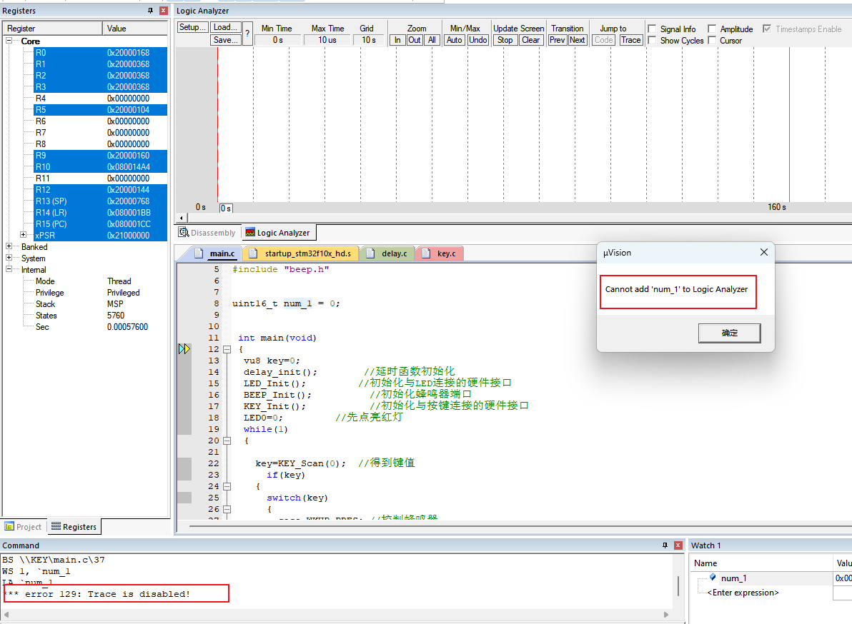 3. 如果在前面的步驟中沒有使能Trace功能的話,在添加變量到Logic Analyzer窗口時候就會提示“Cannot Add ‘xxx’ to Logic Analyzer”,并且在Command窗口中會提示“*** error 129: Trace is disabled!”(如圖2-6)。