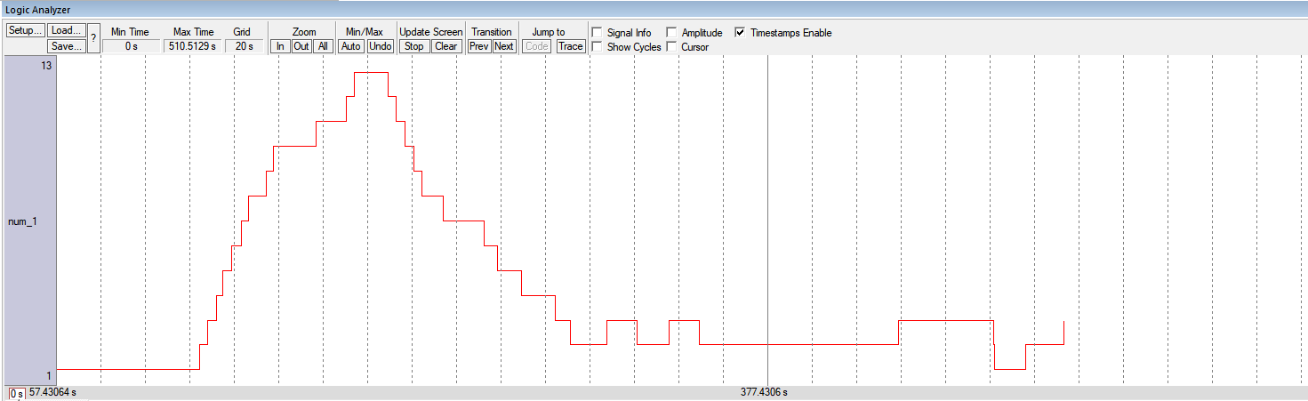 4. 添加好變量到Logic Analyzer窗口后,運行程序后,就會顯示出當前變量的變化情況了。(如圖2-7)注意:這里不會實時顯示波形,需要程序停止運行后,才會顯示出波形。并且只能顯示全局變量和靜態變量的變化情況。