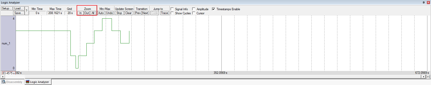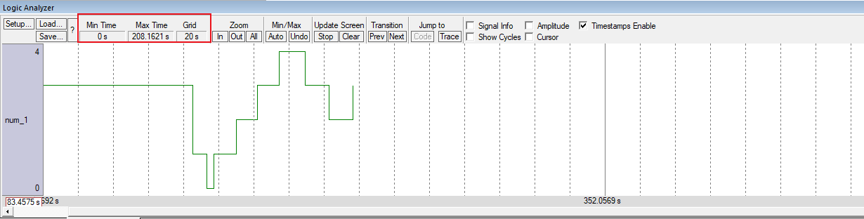 a) Min Time:設置顯示的信號記錄緩沖區中的第一個時間戳。當μVision記錄信號時,時間從零開始,并不斷向前滾動。