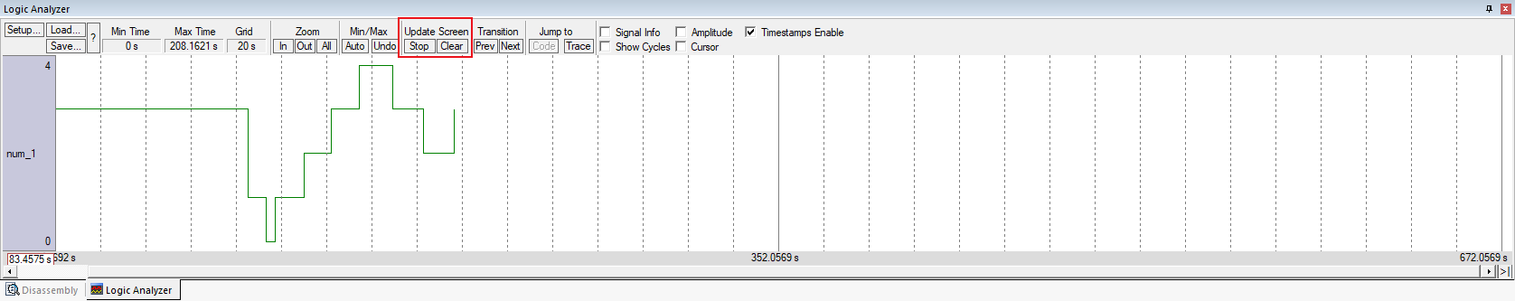 a) Start/Stop:Stop停止更新顯示。μVision繼續填充信號記錄緩沖區。單擊按鈕時,該按鈕將其樣板文本更改為Start。Start用來自信號記錄緩沖區和傳入數據的數據更新顯示。單擊按鈕時,該按鈕將其樣板文本更改為Stop。