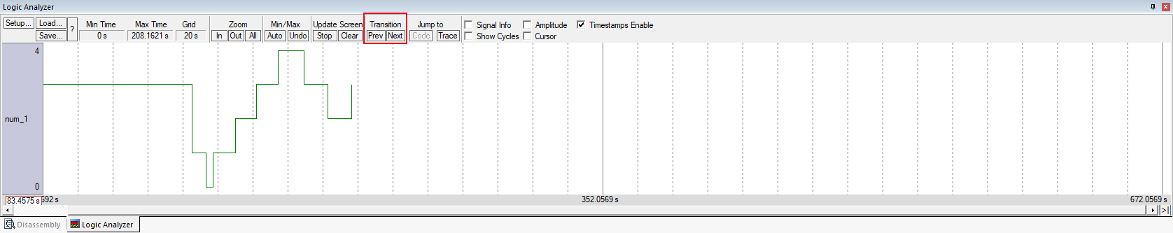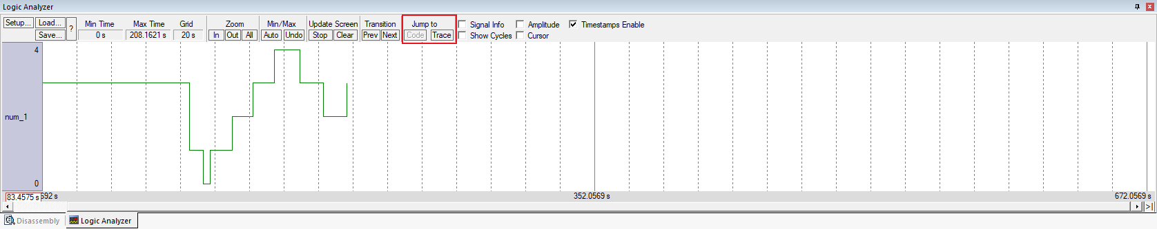 a) Code:打開導致信號轉換的代碼行處的反匯編或源代碼窗口。當程序計數器值被記錄時,該按鈕處于活動狀態。