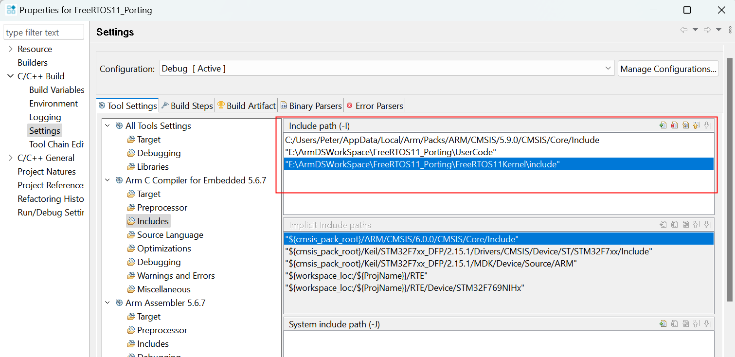2、在項目屬性中,確保添加 FreeRTOS 相關頭文件的路徑。例如,右鍵點擊項目 -> Properties -> C/C++ General -> Paths and Symbols -> Includes