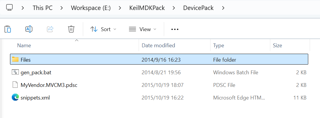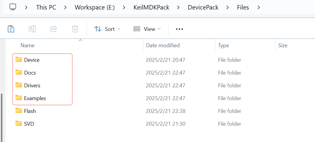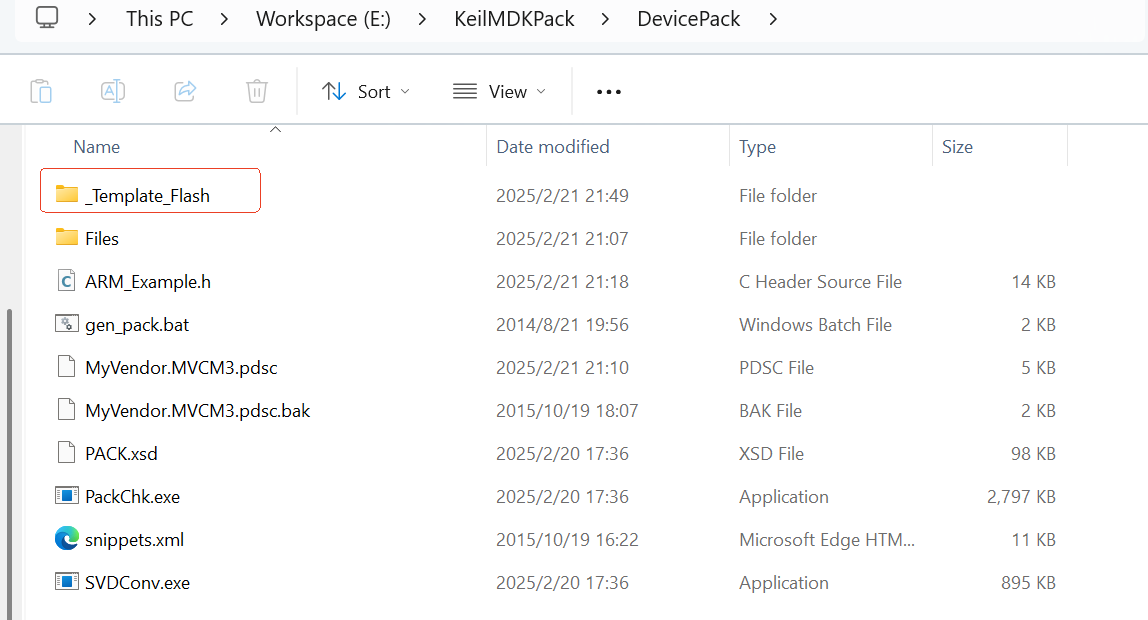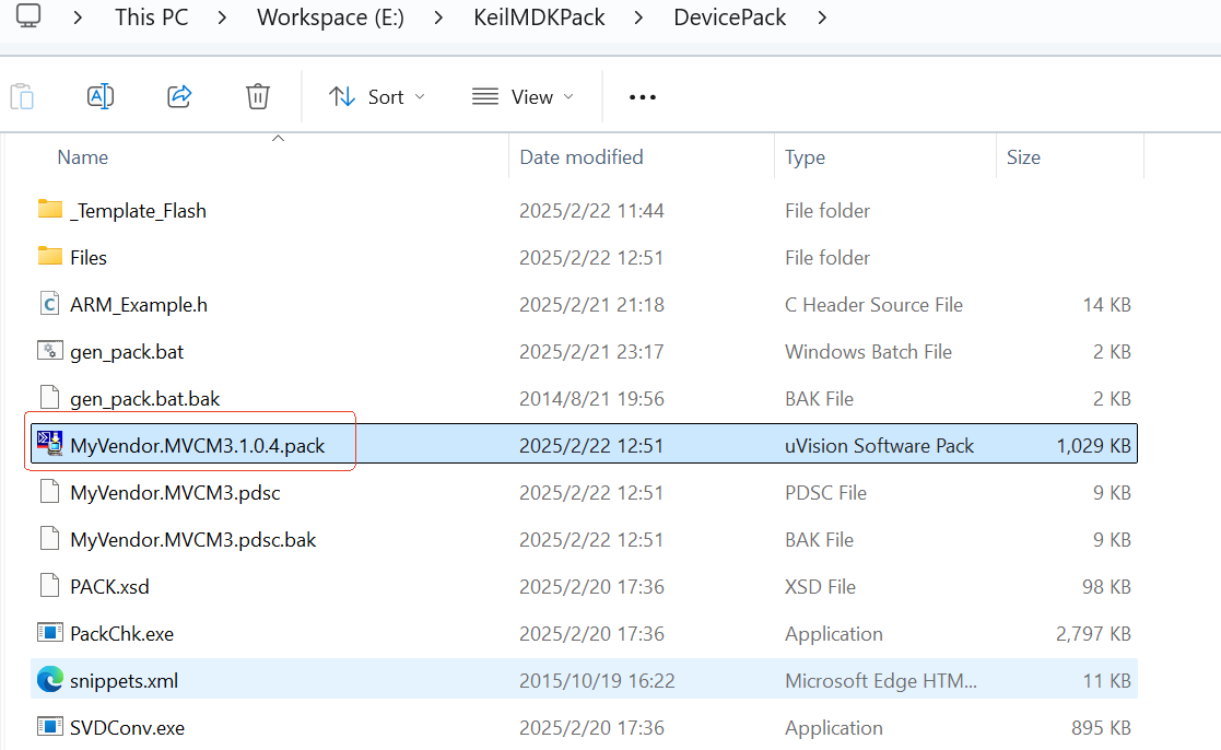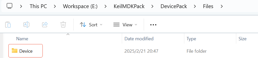 1. 創(chuàng)建一個處理器PACK制作的工作目錄,如E:KeilMDKPackDevicePack。