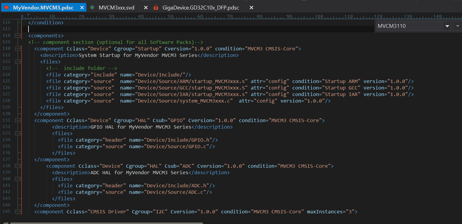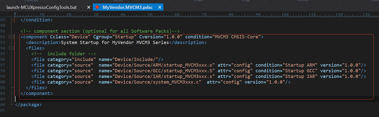 7. 在“MyVendor.MVCM3.pdsc”文件的<components>部分添加如下內(nèi)容,如圖3-6所示: