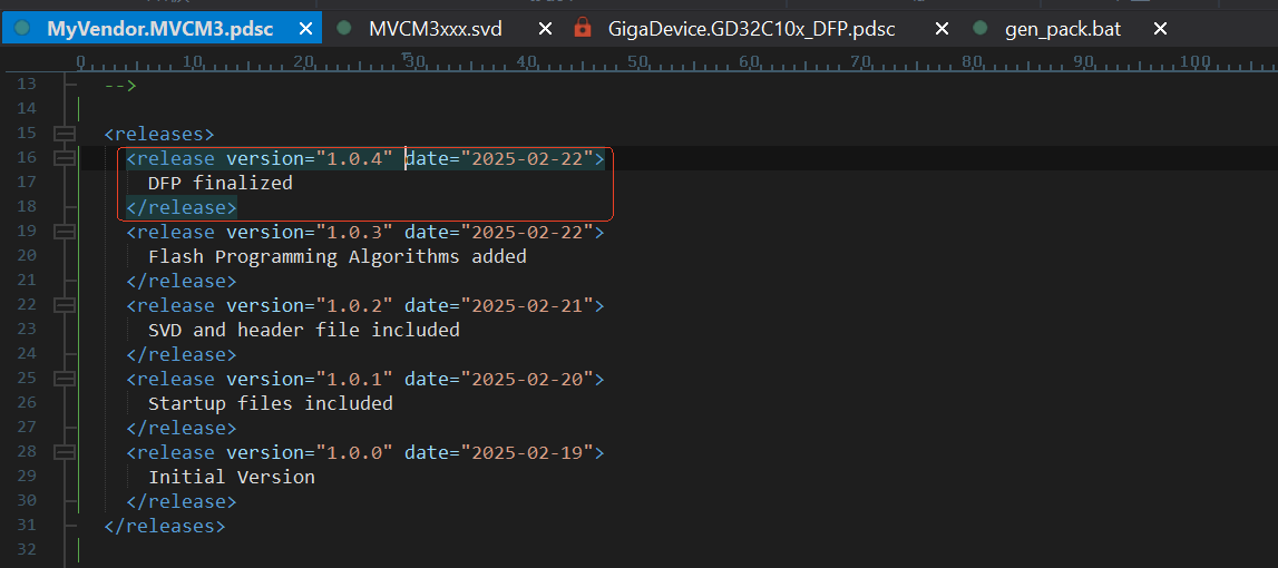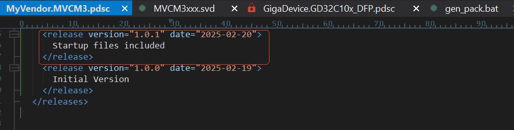 25. 在“MyVendor.MVCM3.pdsc”文件中添加新的版本信息,如圖3-24所示: