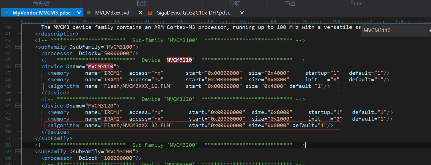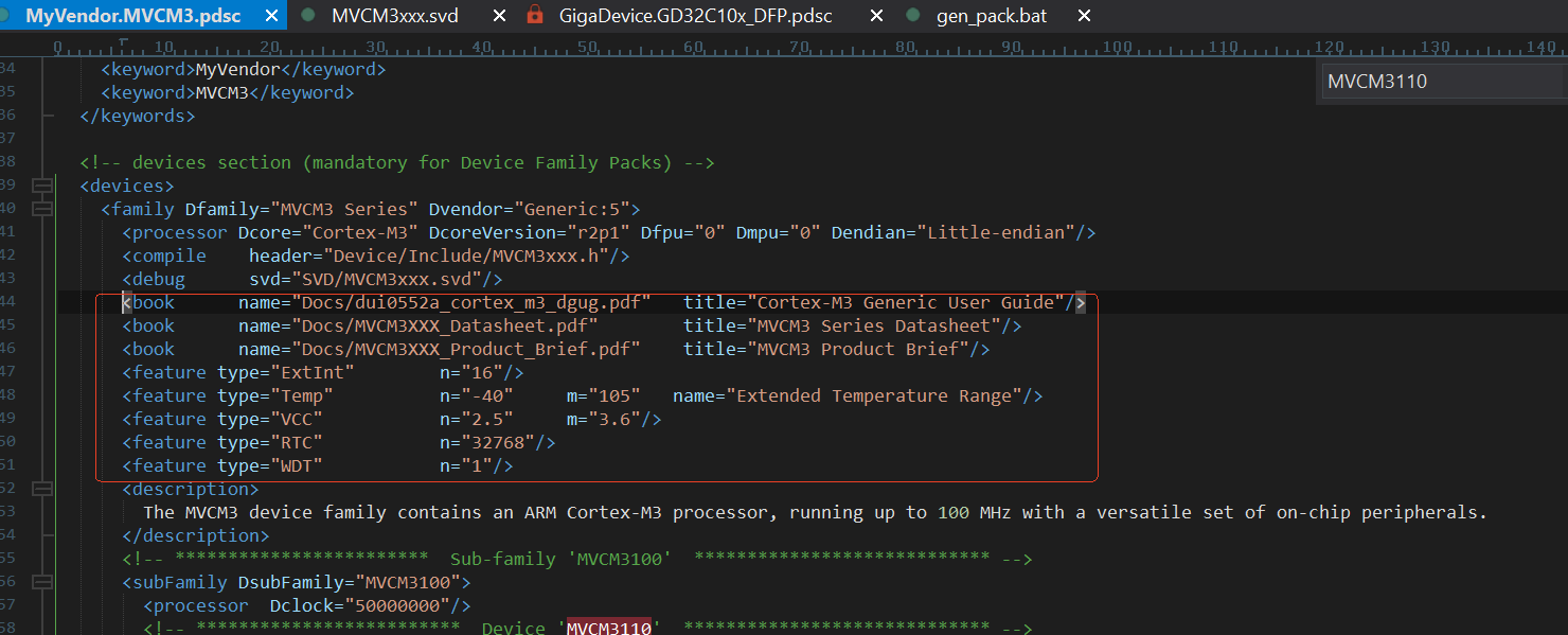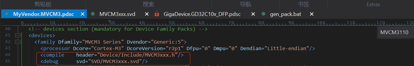 4. 打開“MyVendor.MVCM3.pdsc”文本,在“<devices>”部分添加如下內(nèi)容,如圖3-3所示: