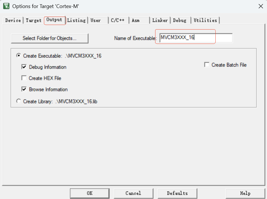 16. 打開“MVCM3XXX_16.uvproj”工程,在選項配置的“Output”中,把執(zhí)行文件名稱修改為“MVCM3XXX_16”,如圖3-15所示: