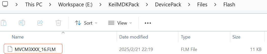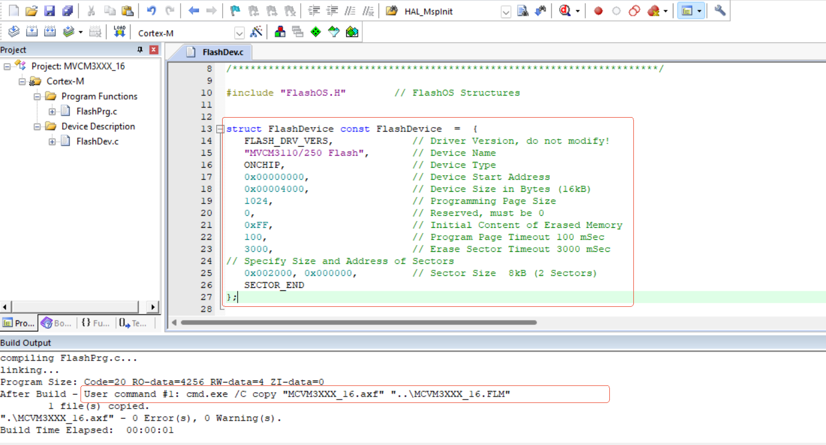17. 在Keil MDK中修改“FlashDev.c”中的一個參數(shù),通過構(gòu)建工程創(chuàng)建“MVCM3XXX_16.FLM”文件(在具體芯片的PACK開發(fā)中,需要調(diào)整FlashPrg.c文件中的編程算法。)如圖3-16所示: