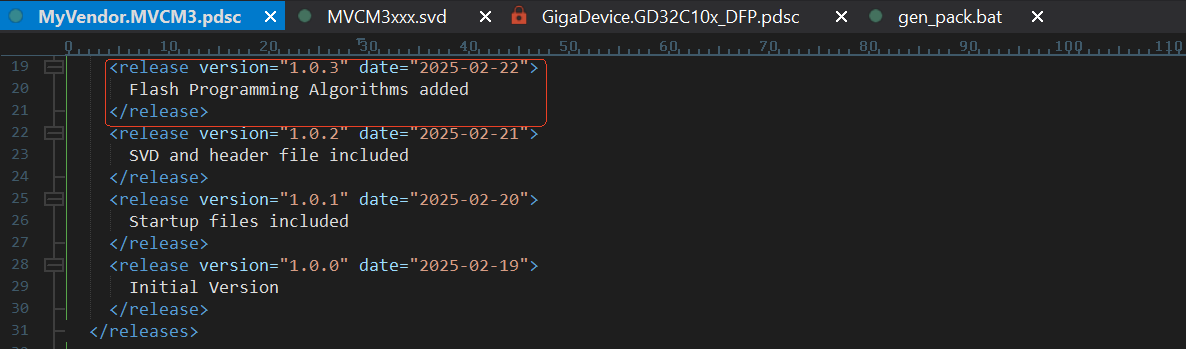20. 在“MyVendor.MVCM3.pdsc”文件中添加新的版本信息,如圖3-19所示: