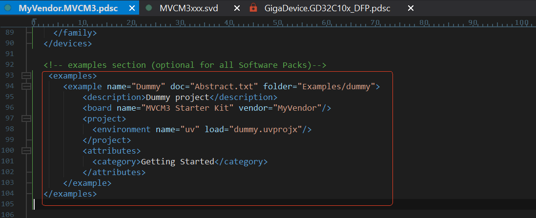 24. 在“MyVendor.MVCM3.pdsc”文件的 <examples>部分添加如下內(nèi)容,如圖3-23所示: