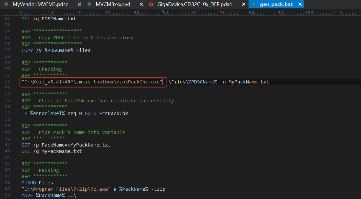 26. 安裝解壓工具7-Zip ,打開“gen_pack.bat”文件,修改“PackChk.exe”文件的路徑,如圖3-25所示: