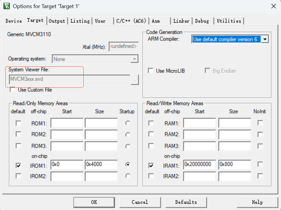 <memory name="IRAM1" access="rw" start="0x20000000" size="0x0800" init ="0" default="1"/>