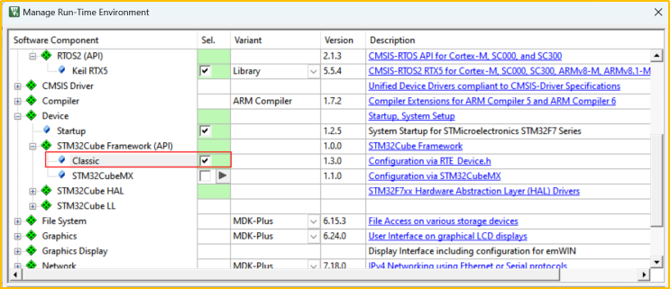 5. 選擇“Devide-->Startup”和“Device-->STM32Cube Framework-->Classic”組件,如圖3-5