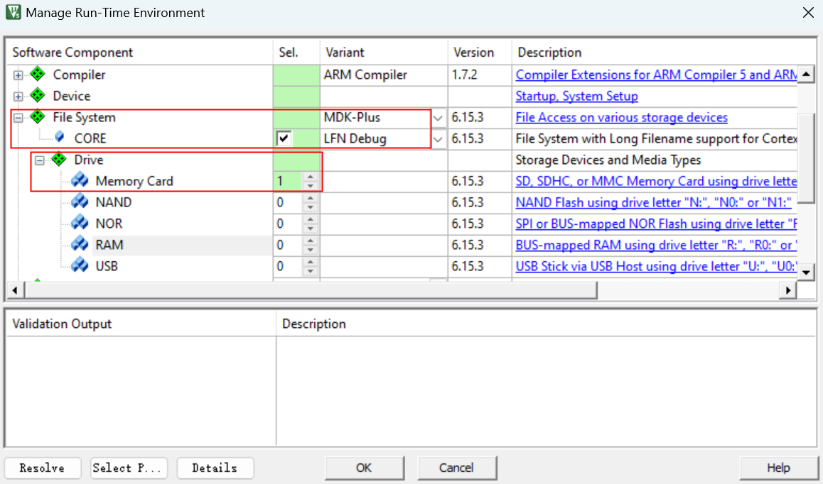 6. 選擇“File System-->CORE”,并設(shè)置“File System-->Drive-->Memory Card”組件,點擊“Resolve”完成相關(guān)組件的添加,如圖3-6所示: