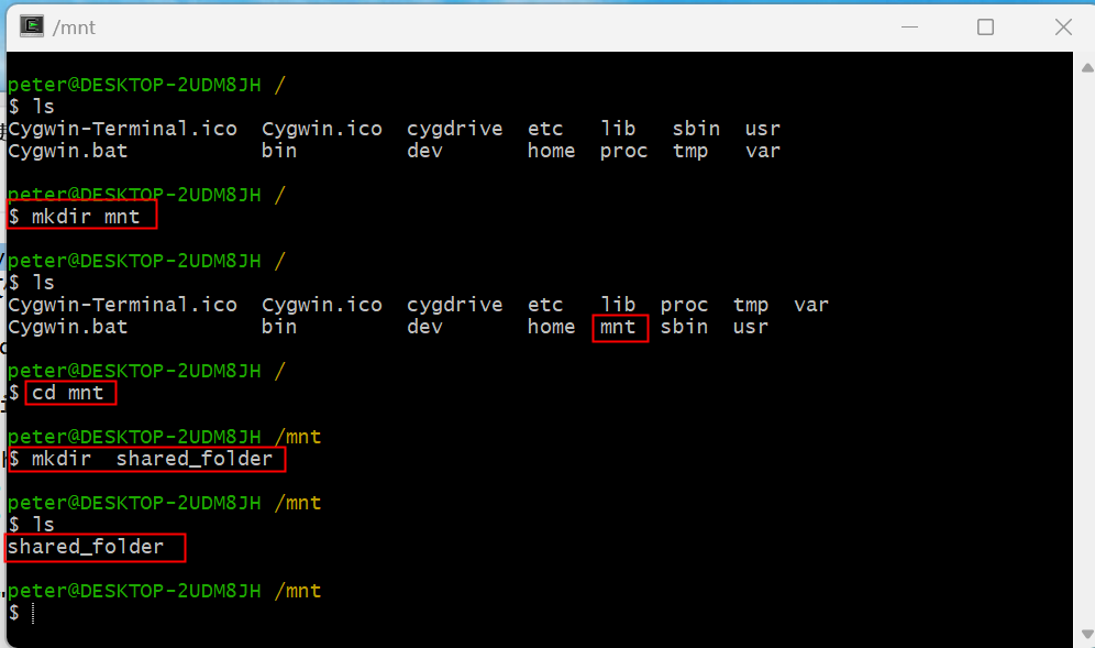 4. 在Cygwin中根目錄下,創建“mntshared_folder”目錄,所圖3-4所示: