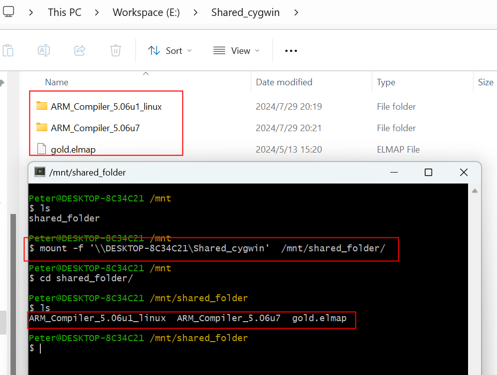 5. 通過輸入“ mount -f '\DESKTOP-2UDM8JHShared_cygwin' /mnt/shared_folder/“命令把Windows下的共享目錄”Shared_cygwin“掛載到Cygwin的”/mnt/shared_folder/“目錄下,以后就可以通過Windows下的共享目錄”Shared_cygwin來實現Windows與Cygwin之間的文件傳輸,如圖3-5所示: