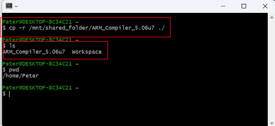 6. 把Windows版本的ARM編譯器復制到“/home/Peter”目錄下,并創建一個“Workspace”目錄,如圖3-6所示:(注:Cygwin下無法識別Linux版本的ARM編譯器)