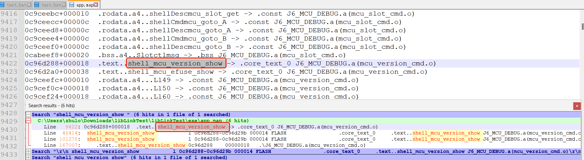 工程中源代碼編譯生成J6_MCU_DEBUG.map文件,文件內可以看到相應shell_mcu_version_show的調用信息,但將該工程代碼打包成J6_MCU_DEBUG.a文件,發現該.a文件在link后的app.Map文件內沒有shell_mcu_version_show的相關地址和調用信息。