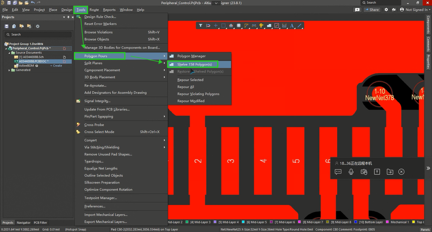 經過測試,此問題使用 Shelve Polygon:Tools -> Polygons Pours -> Shelve Polygons 該方法,使用后,PCB 編輯延時正常。
