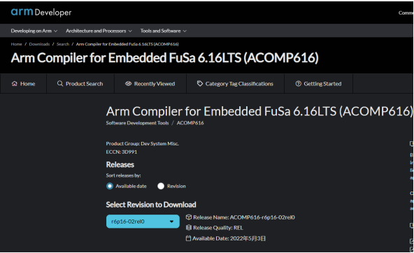 1)、首先,需要在ARM官網(wǎng)中下載Arm Compiler for Embedded FuSa 6.16LTS的安裝包。(如圖4-1)
