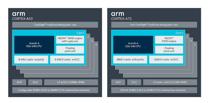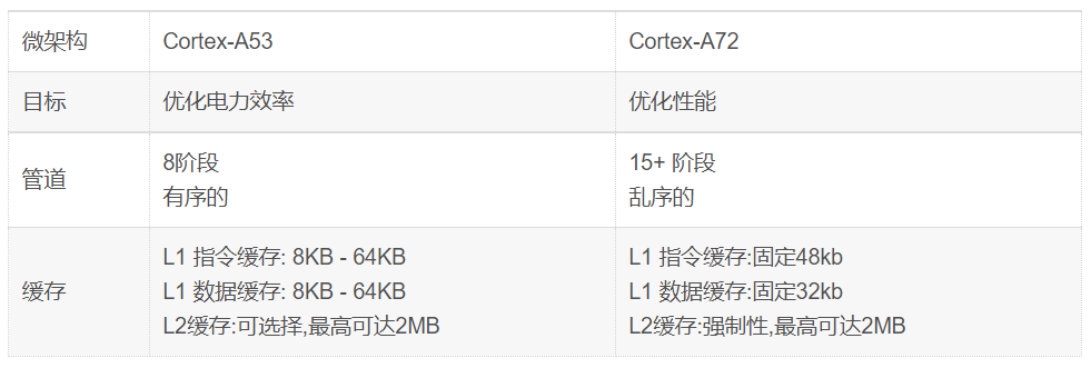 例如,Cortex-A53和Cortex-A72都是Armv8-A架構的實現。這意味著它們具有相同的架構,但它們具有不同的微架構。如下圖和表所示: