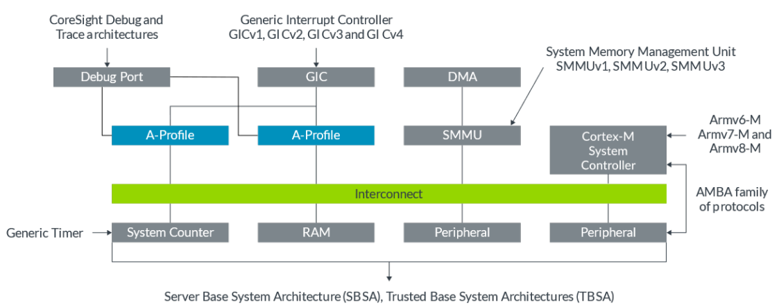 ARM架構(gòu)是最有名的ARM規(guī)范,但它并不是只有這些。ARM對(duì)于構(gòu)成現(xiàn)代系統(tǒng)芯片的許多部件都有類似的規(guī)范。