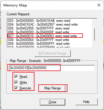 3)、如果想要設置某一個內存范圍的權限,可以在Map Range下面的輸入框中對應的內存范圍。然后,可以通過勾選下面的Read、Write、Execute來配置對應內存范圍的權限。然后,點擊Map Range將指定的內存范圍添加到列表當中。(如圖4-3)