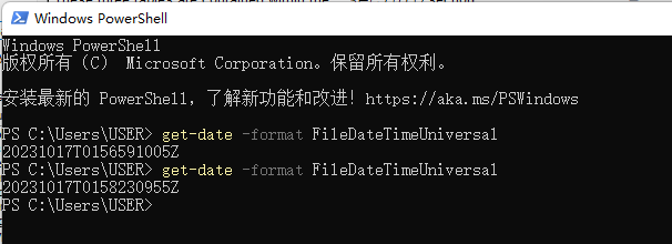 2)、具體的時間查看,請在Windows PowerShell中執行get-date -format FileDateTimeUniversal命令去查看具體的時間信息(如圖4-2)。圖片中顯示的20231017T0158230955Z表示2023Y10M17d01H:58m:23s:0955ms。"T"表示時間分隔符,"Z"作為UTC指示器。