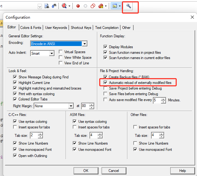 1)、在Configuration窗口中,切換到Editor欄中,可以在File&Project Handing中勾選上“Automatic reload of externally modified files ”(如圖4-1)。開啟這個選項(xiàng)后,就可以在第三方編輯器中修改完代碼后,回到MDK就會自動重新加載文件,不需要再次確認(rèn)。