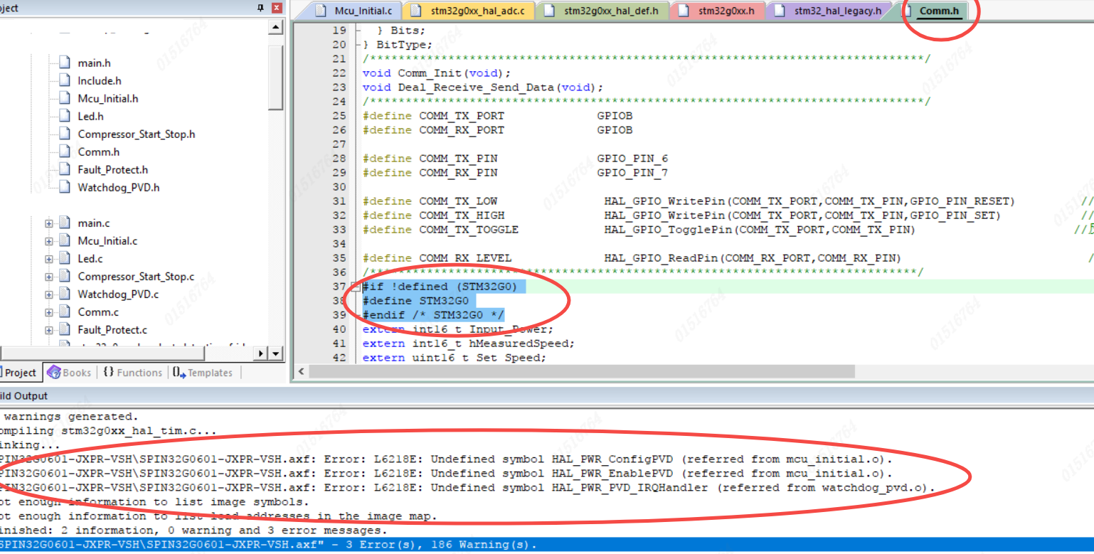 定義在STM32G0xx .h中的函數(shù),它總是包含在基于STM32G0xx設(shè)備的項目中并使用。將STM32G0xx .h修改部分還原,并且將其文件格式設(shè)置為可讀即可,如圖4-1在Comm.h文件并進行宏定義,而后編譯出現(xiàn)錯誤,符合檢查動態(tài)語法規(guī)則。