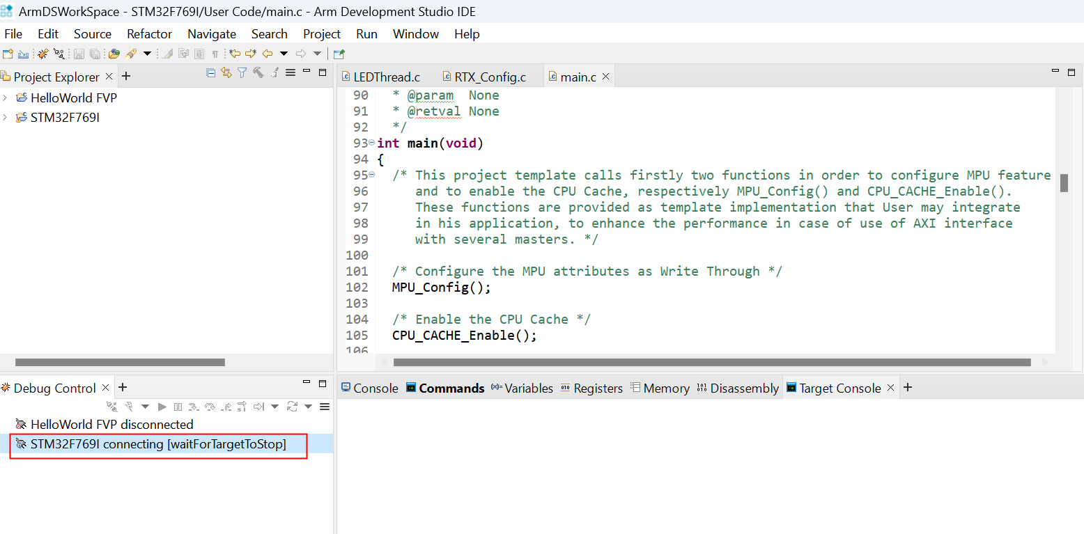 解決ArmDS在開(kāi)發(fā)Coretex-M處理器時(shí),進(jìn)入調(diào)試模式時(shí),PC指針無(wú)法到達(dá)入口地址處,在調(diào)試控制窗體中,一直在等待目標(biāo)設(shè)備停止(waitForTargetToStop),如圖2-1所示: